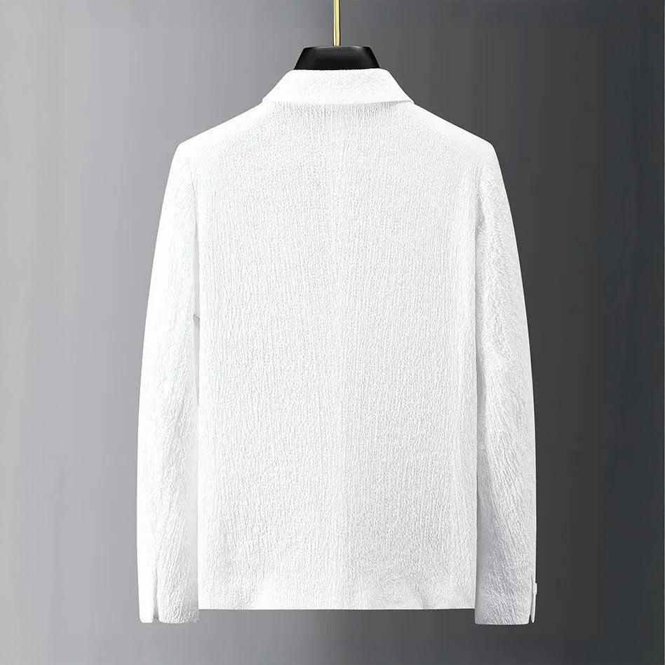 An anti-sweat stretch weave keeps the unlined blazer and drawstring trousers dry and breathable, even when meetings stack up. Subtle texture sharpens the relaxed cut, delivering a business-casual kit that moves like athleisure and looks board-ready.